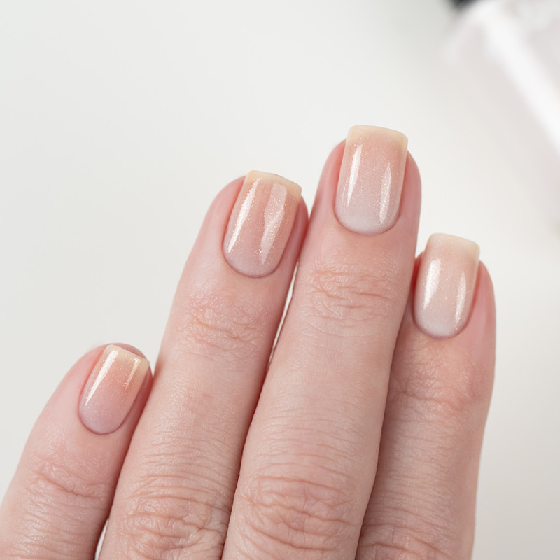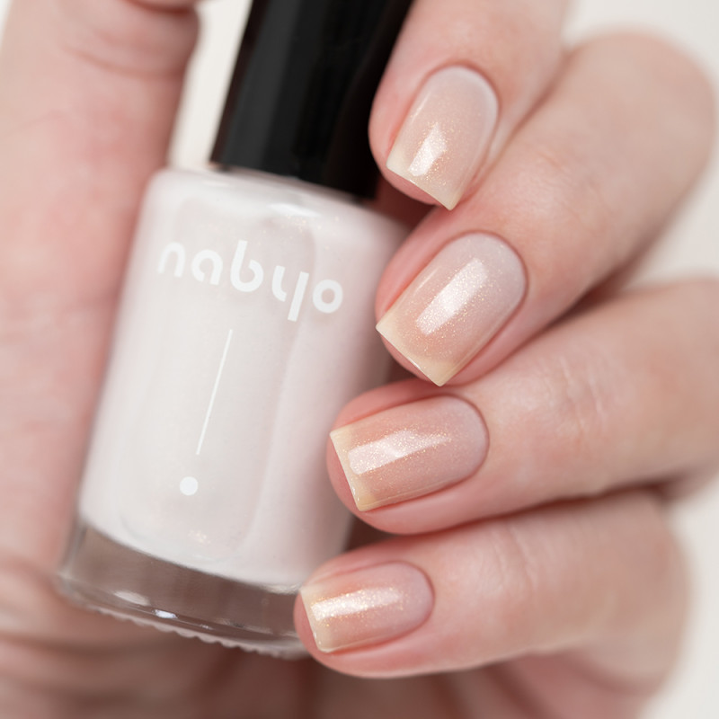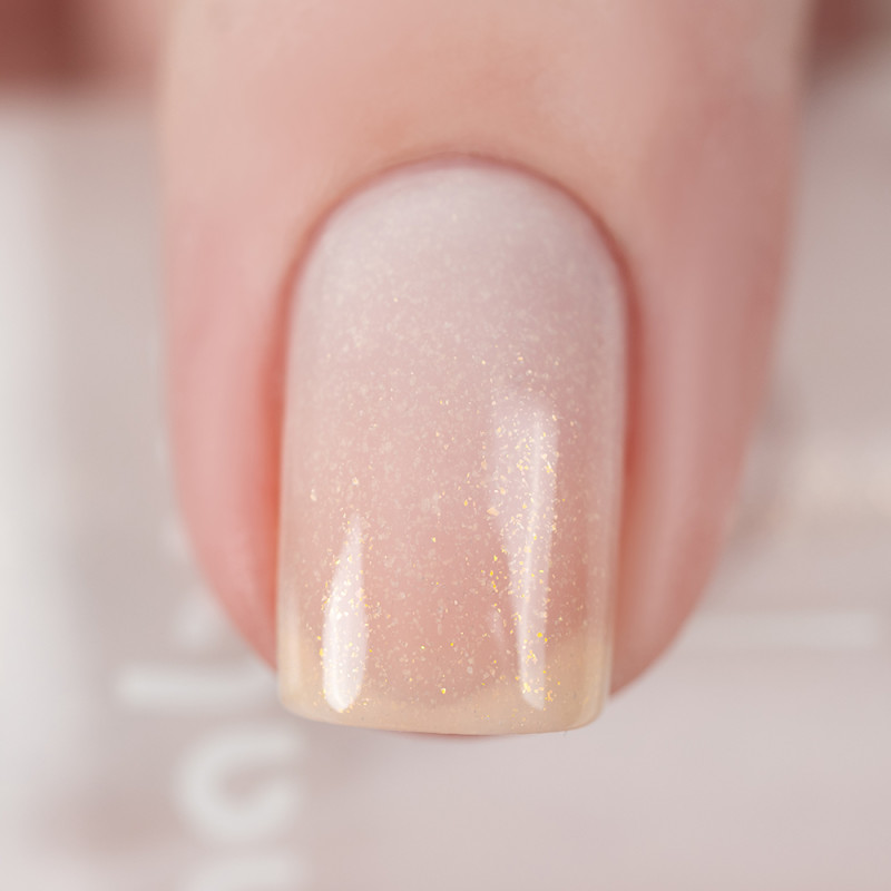 Полупрозрачный молочно-бежевый лак с ярким искристым золотистым шиммером.
