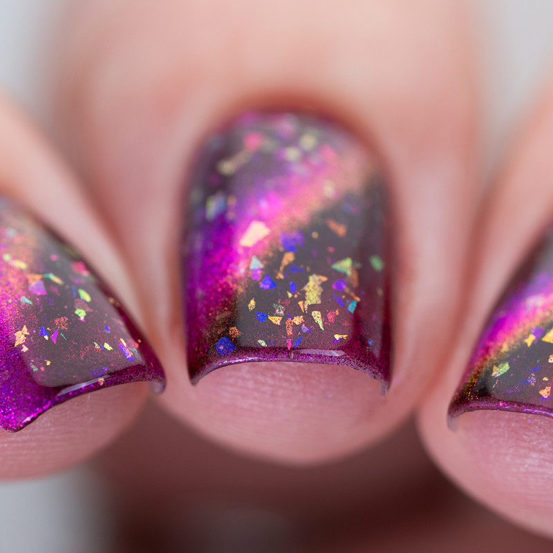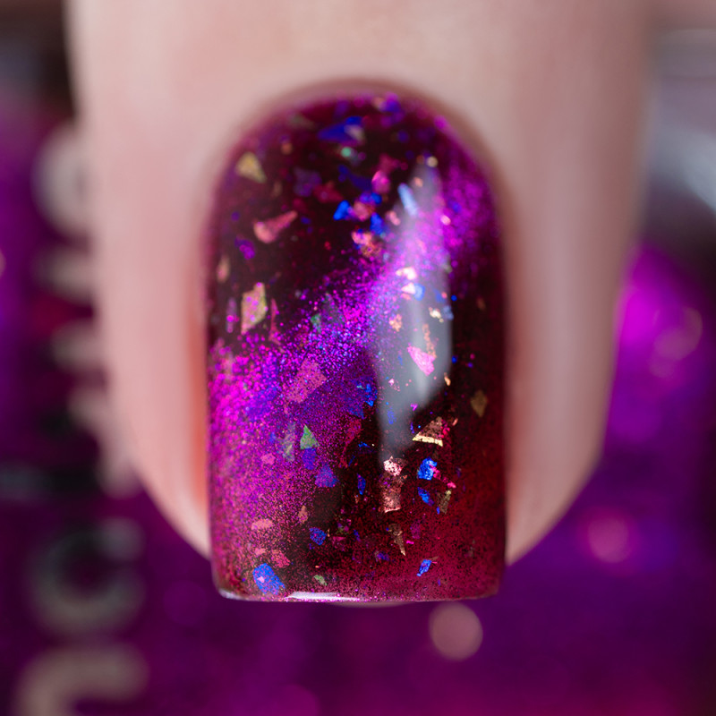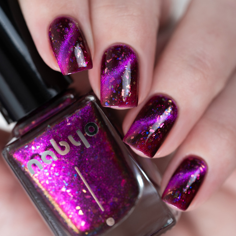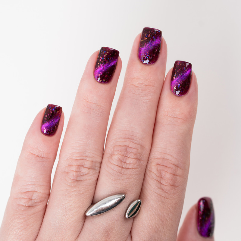 Магнитный лак с фиолетовым и розовым бликом и разноцветной слюдой. Может окрашивать ногтевую пластину.
