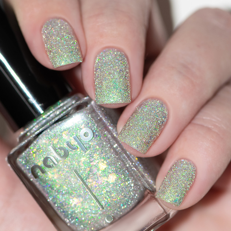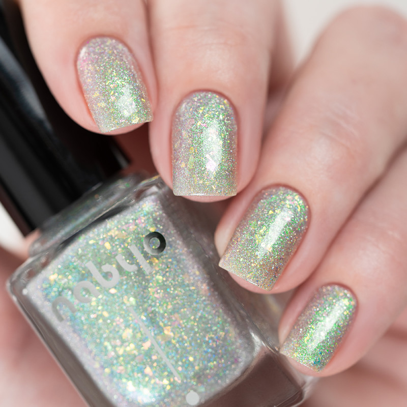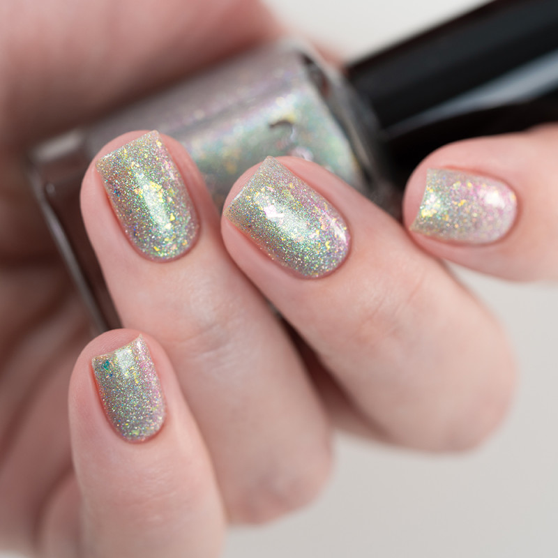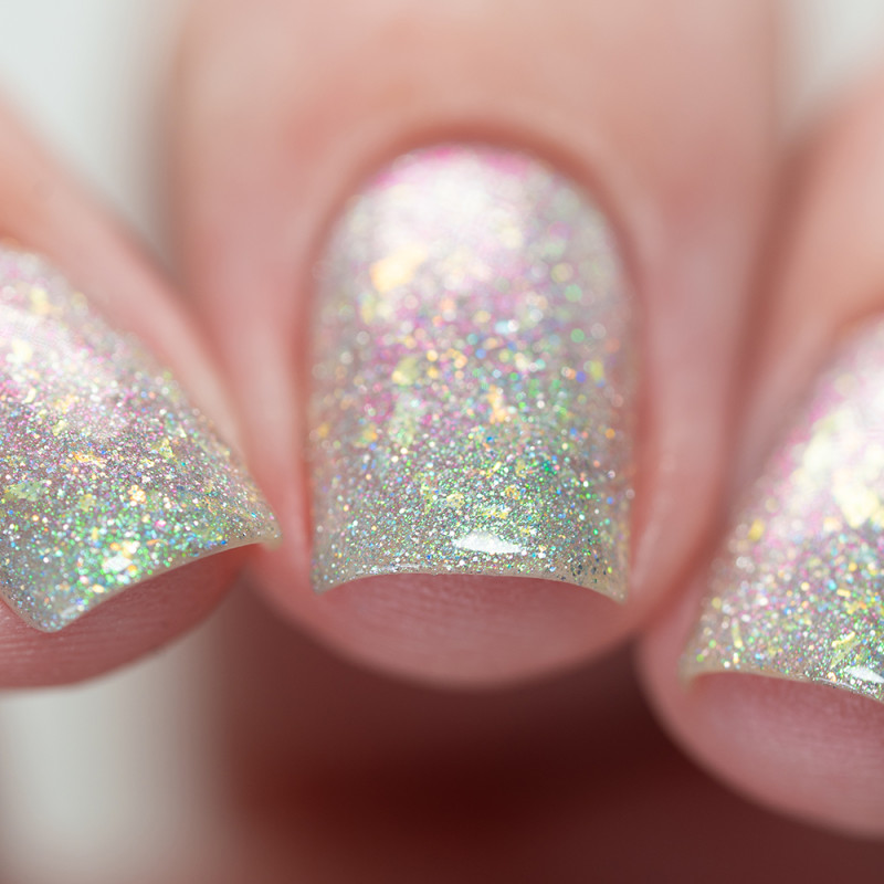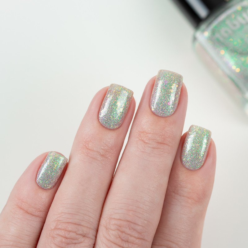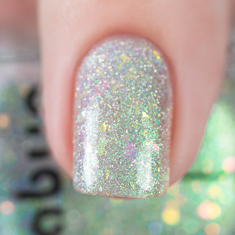 Шиммерный лак с зелено-розовым отливом, красной и золотой слюдой и разноразмерным голографическим и светоотражающим глиттером. Может потребоваться 2 слоя топового покрытия.