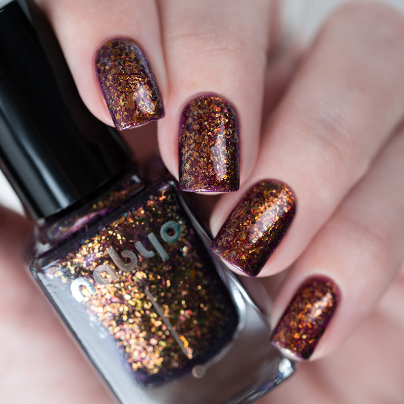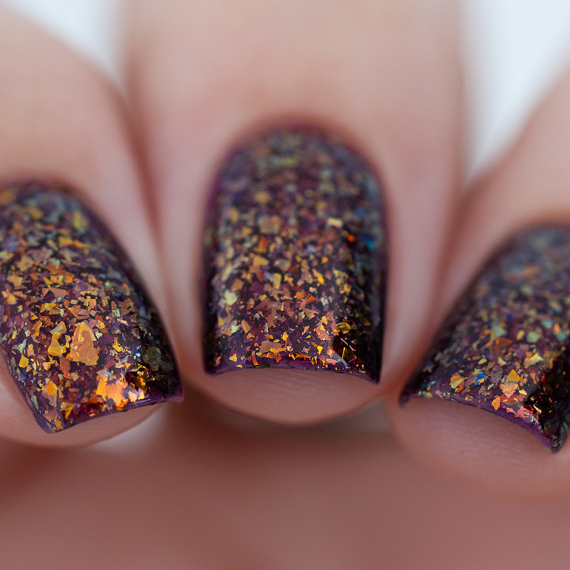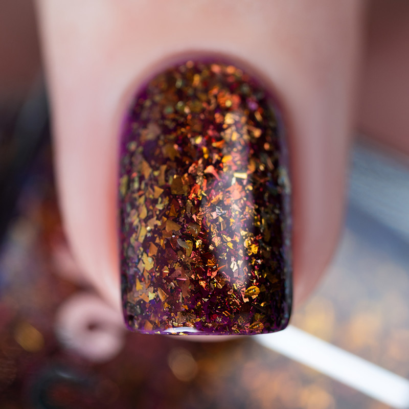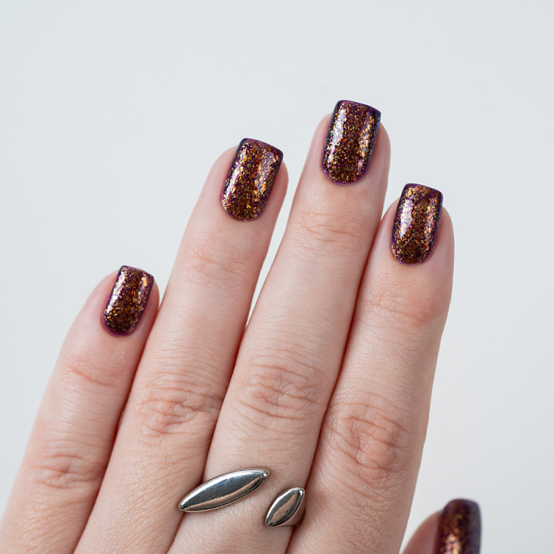 Чуть окрашенное фиолетовое желе с яркой бронзовой слюдой с красным и зеленым отливом. В 2-3 слоя создает эффект фольги.