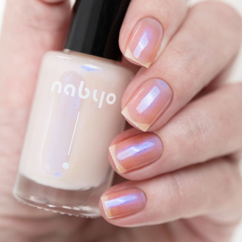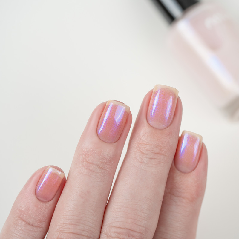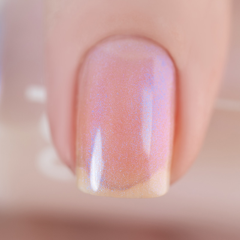 Полупрозрачный бежевый лак с ярким искристым синим шиммером.