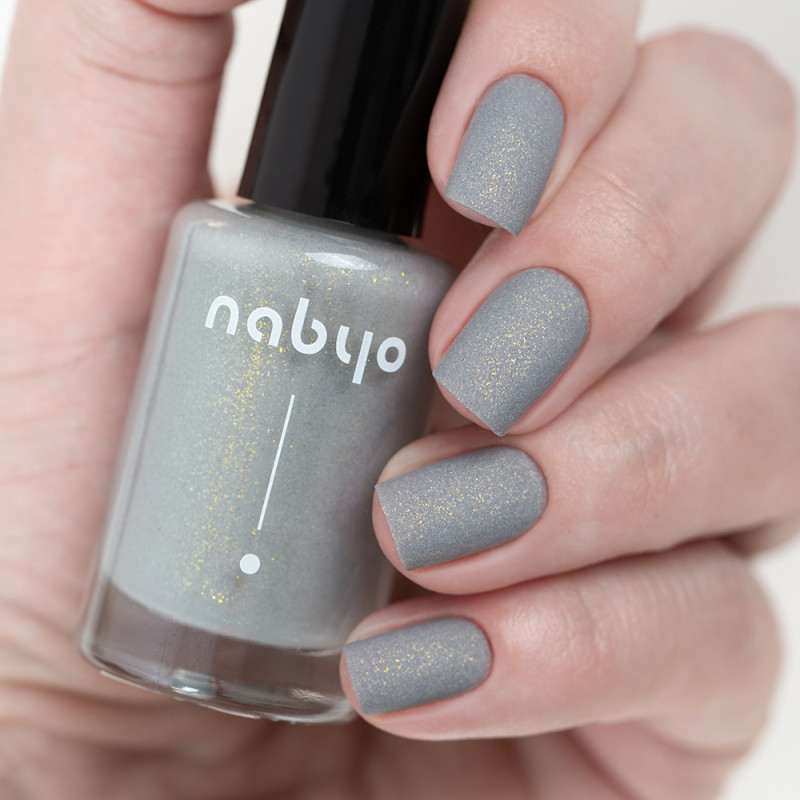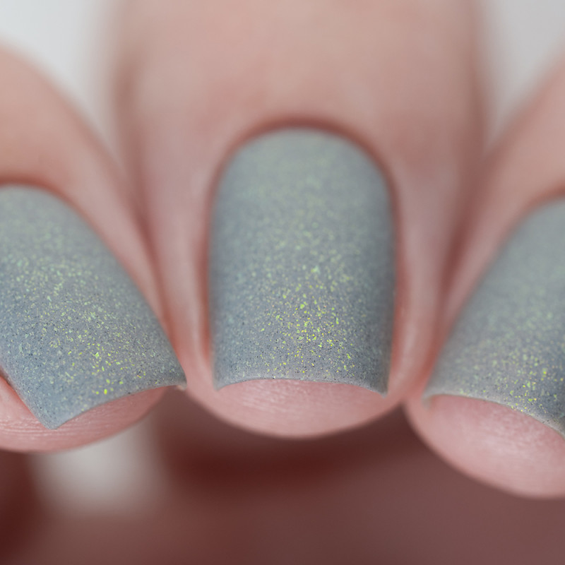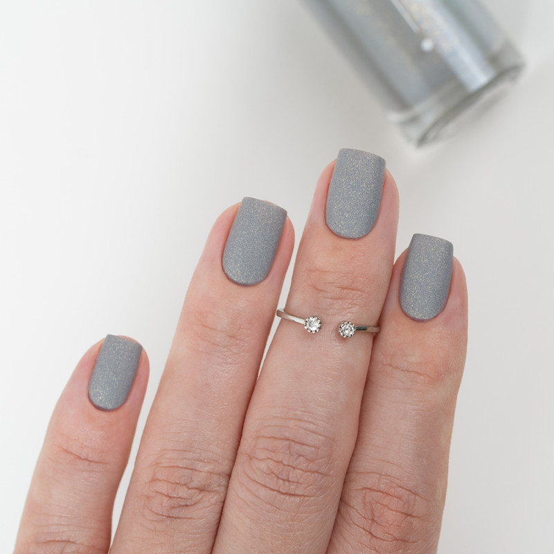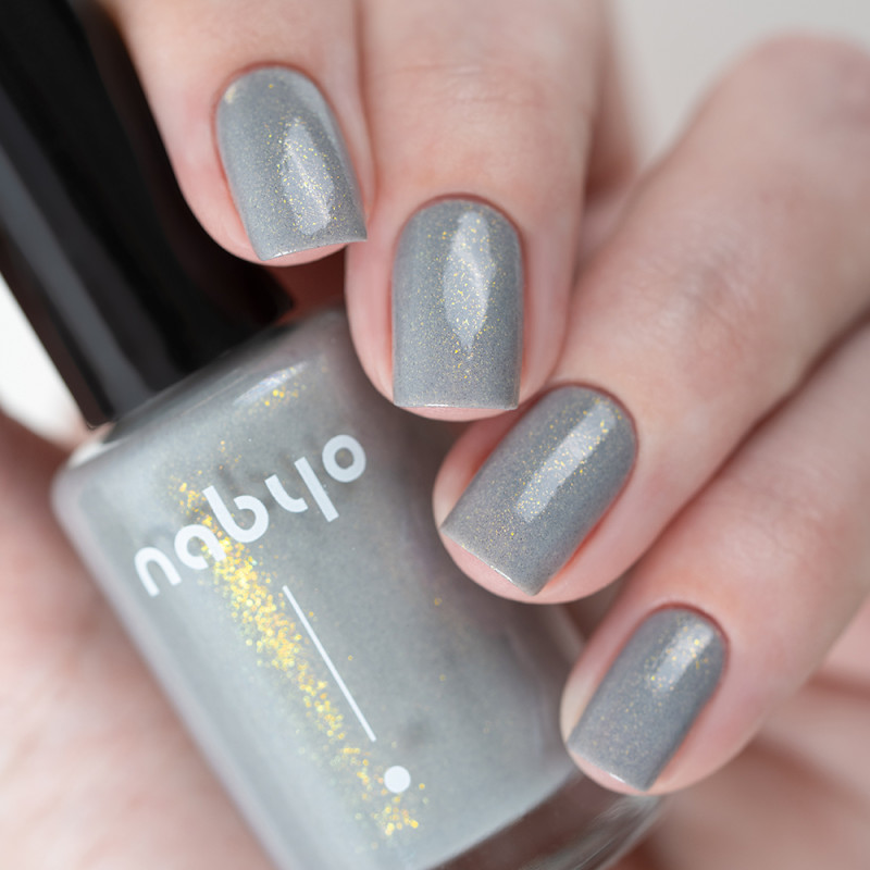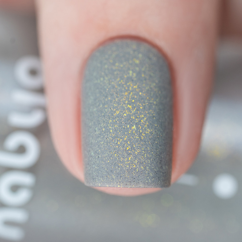 Нежно-серый матовый лак с золотисто-зеленым шиммером.